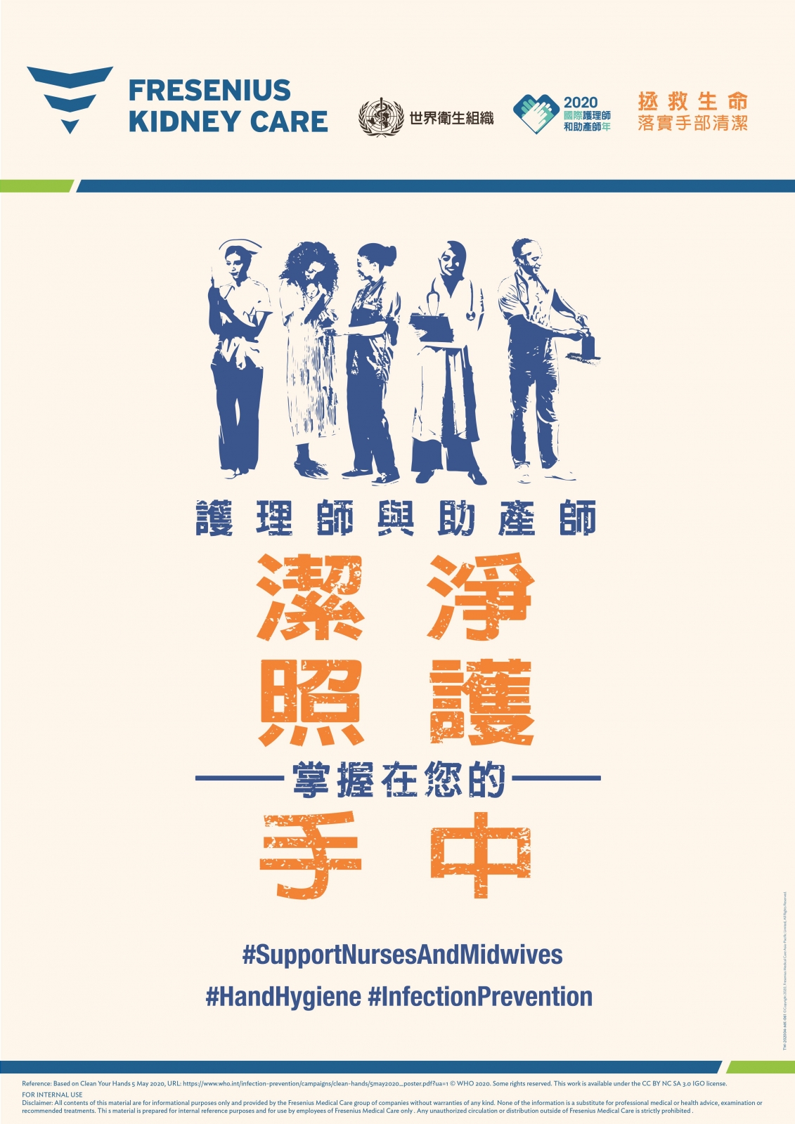 每年5月5日為世界衛生組織(WHO)訂定的世界手部衛生日,今年面對全球疫情的大流行,手部衛生之於公共健康更是比以往任何時候都更得顯重要。在醫療院所,正確完善的手部衛生落實是阻止新冠肺炎(Covid-19)以及其他眾多病毒細菌傳散的一個重要措施。因此,今年世界手部衛生日推廣的重點特別聚焦於「清潔照護」,以「護理師與助產師 清潔照護掌握在您的手中 (Nurses and Midwives, clean care is in your hands!)」作為主題,藉此強調護理人員在預防「可避免的感染」上扮演的重要角色。這個主題的發想,主要是呼應WHO訂定2020年為「國際護理師與助產師年」,並認可他們對於加強優質衛生系統的重要貢獻。如同以往,本透析中心今年也積極響應,並且很榮幸地邀請和暘診所院長尤鑽石醫師擔任【5月愛腎駐站醫師】,尤醫師將分享針對透析中心落實手部衛生的重要性,並提供正確乾/濕洗手的小撇步,快來了解尤醫師怎麼說吧~
